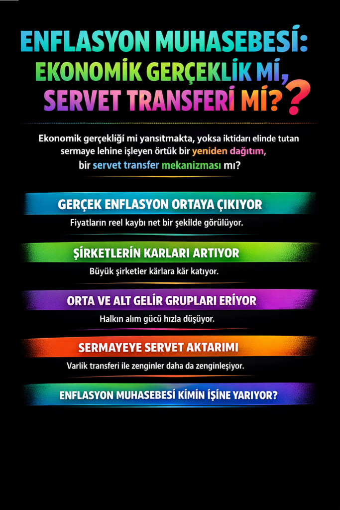 şeklinde sıralanabilir.Devletin rolü de bu tabloda önemlidir. 2025-2027 VUK enflasyon düzeltmesinin ertelenmesi, kısa vadede nominal vergi geliri sağlamış ancak uzun vadede sermaye birikiminin belirli gruplar lehine yoğunlaşmasına zemin hazırlamıştır. Bu durum, kamu kaynaklarının dolaylı yoldan büyük özel sermayeye aktarılması olarak da okunabilir.Sonuç olarak enflasyon muhasebesi, gelir ve servet dağılımı eşitsizliğini derinleştiren bir mekanizma işlevi görmektedir. Muhasebe standartları ve vergi politikalarının kesişim noktasında oluşan bu araç, toplumsal servetin “kimin lehine” yeniden dağıldığını belirlemede sessiz ancak güçlü bir rol oynamaktadır.
