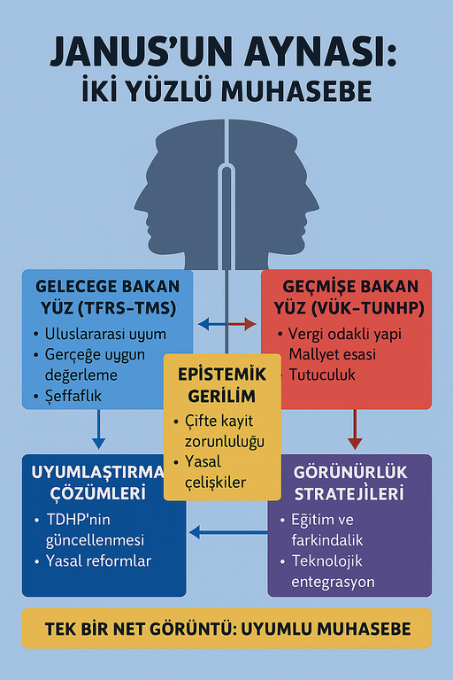Janus’un İki Yüzlü Aynası, Türkiye muhasebe sistemindeki epistemik gerilimi anlamak ve çözümlemek için güçlü bir metafor sunar. TFRS–TMS’nin “geleceğe bakan” yüzü, uluslararası uyum, gerçeğe uygun değerleme ve şeffaflığı temsil ederken (IFRS Foundation, 2023), VUK–TDMS–TDHP’nin “geçmişe bakan” yüzü, devletin vergi denetimi ve yerel mali kontrol ihtiyaçlarına odaklanır (Çelik, 2016, s.120). Bu ikilik, işletmeler için yalnızca çift kayıt yükü, finansal tablolar arasında tutarsızlık ve küresel piyasalarda güven kaybı gibi teknik sorunlara yol açmakla kalmaz; aynı zamanda muhasebenin epistemik rolü üzerinde de derin etkiler yaratır (Hines, 1988, s.252).