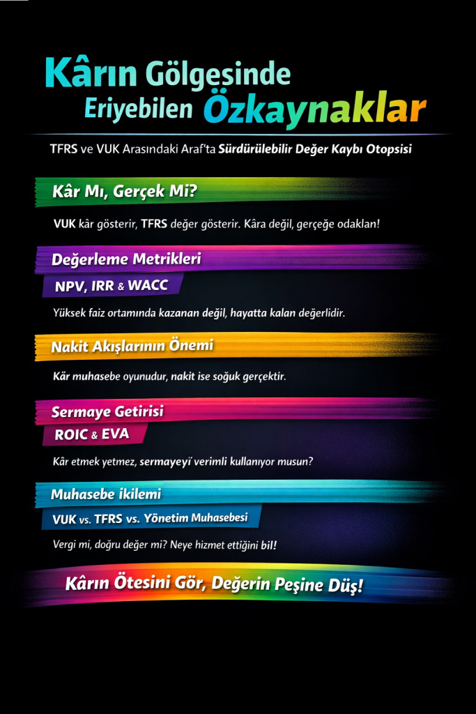 TEPAV’ın “2025’in Kırılmaları, 2026’nın Hesabı” bülteninden hareketle, 2025 yılı geçici dalgalanmalardan çok yapısal dönüşümlerin belirginleştiği bir yıl olmuştur. Kalıcı yoksulluk, gelir eksikliğinden ziyade düşük verimlilik-düşük ücret döngüsü, zayıf öğrenme ve teknoloji yayılımı, kırılgan istihdam yapısı ile dışa bağımlı üretim modelinden kaynaklanmaktadır. Bu yapısal sorunlar, mikro düzeyde işletmelerin finansal baskısını artırırken nominal kâr görünümünü yanıltıcı hale getirebilmektedir. 2026 yılında en önemli risk, batık maliyetlerin gölgesinde yükselen sermaye maliyetlerinin yeterince dikkate alınmamasıdır.Finansal analiz, yalnızca rakamların teknik işlenişi değil, bu rakamların ardındaki ekonomik gerçekliği –işletmenin uzun vadede değer yaratma ya da eritme kapasitesini– yorumlama becerisidir. Finansal tablolar, gerçeğin kendisi değil, belirli muhasebe standartları (VUK veya TFRS) çerçevesinde hazırlanmış temsillerdir. Bu ayrım, disinflasyon sürecinin devam ettiği (Ocak 2026 yıllık TÜFE %30,65) ancak reel faizlerin yüksek seyrettiği (%37 politika faizi – TCMB’nin Ocak 2026 indirimi sonrası) Türkiye ekonomisinde kritik önem taşır. Bir işletme VUK esaslı tablolarda kârlı görünürken, enflasyon ve sermaye maliyeti etkisini dikkate alan TFRS bakış açısında özkaynak erimesi yaşayabilir. Yönetim muhasebecisinin asli görevi, muhasebe kârını aşarak ekonomik değer yaratımını ve nakit akışlarının sürdürülebilirliğini değerlendirmektir.Türkiye’deki finansal raporlama sistemi, bir yanda uluslararası standartlara (TFRS/TMS) dayalı “gerçeğe uygun değer” yaklaşımı, diğer yanda vergi odaklı VUK/TDHP kuralları arasında denge kurmaya çalışmaktadır. Dipnotlar, standartlara göre önemli açıklamalar içermesi gerekirken uygulamada sıklıkla yetersiz kalabilmektedir:
