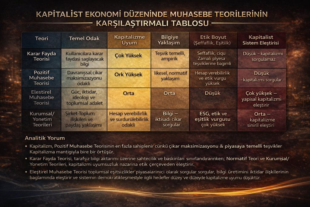 - Eleştirel Muhasebe Teorisi ise kapitalizmi yapısal olarak sorgular, bilgi üretimini iktidar ilişkilerinin bir parçası olarak görür ve sistemin demokratikleşmesini talep eder; bu yüzden kapitalizmle uyumu düşüktür.